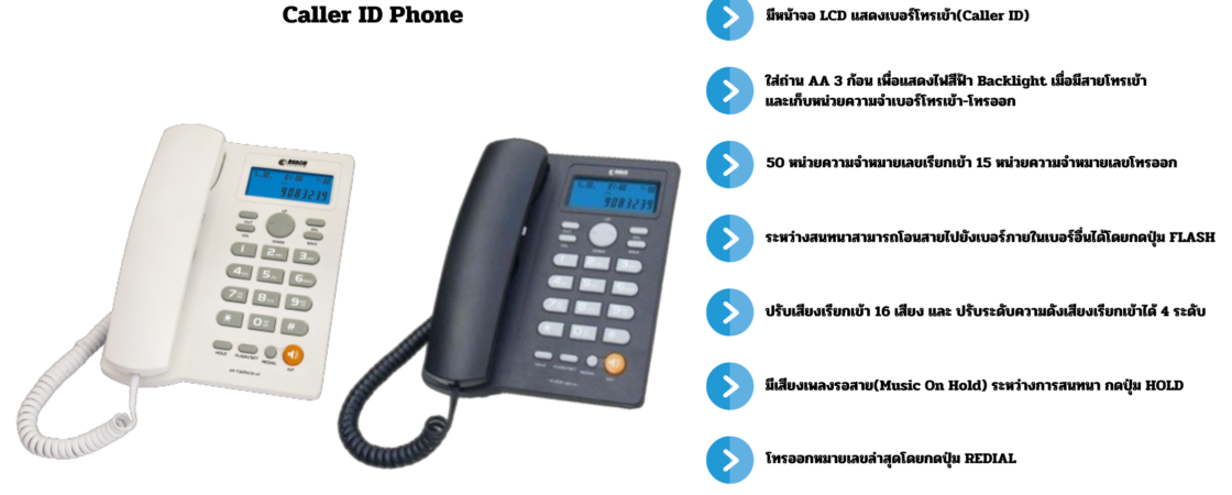 ㆍใส่ถ่าน AA 3 ก้อน เมื่อใส่แล้วหน้าจอมีไฟสีฟ้า และ กรณีที่ถอดสายสัญณาณโทรศัพท์ ตัวเครื่องจะเก็บ วันที่ เวลา เบอร์โทรเข้า เบอร์โทรออกได้ ถ้าไม่ใส่ถ่านจะเก็บไม่ได้แต่ใช้งานได้