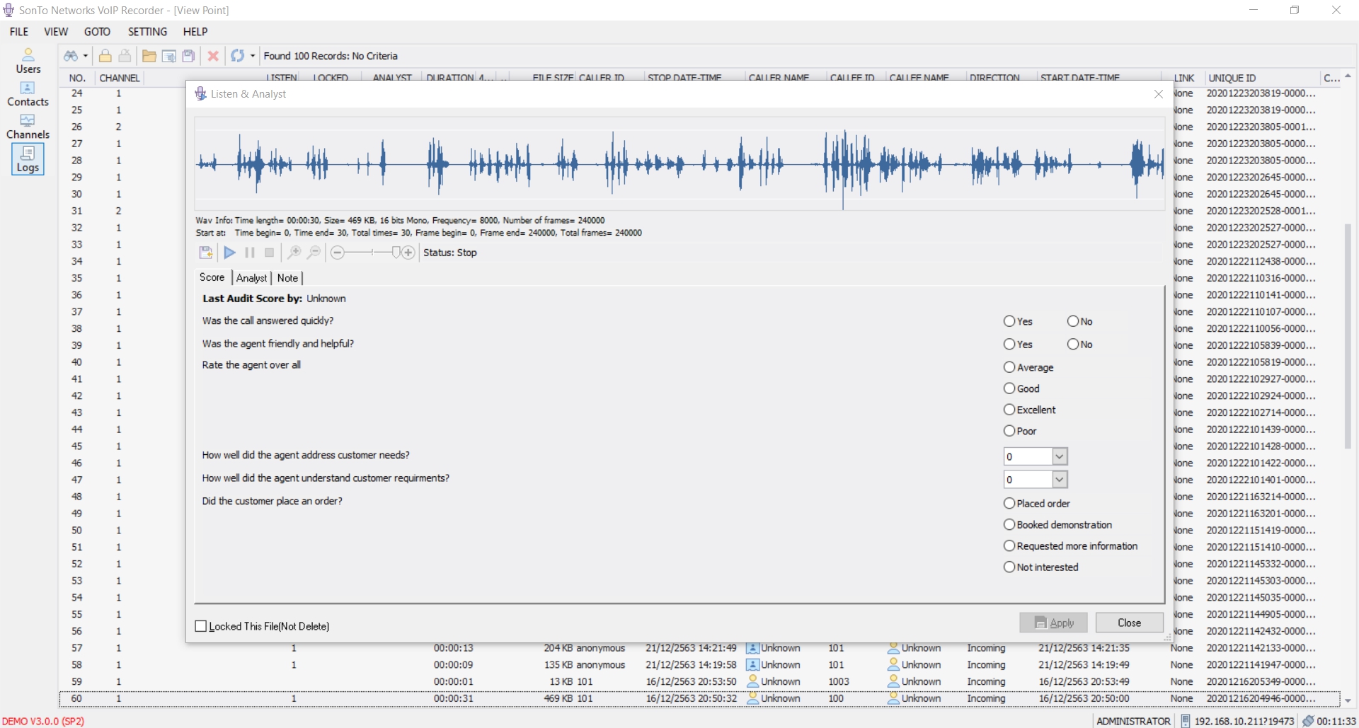 – สามารถเข้าฟังเสียงและจัดการข้อมูลเสียงได้ง่าย โดยสามารถประเมินผลการสนทนาผ่านระบบ ดังนี้