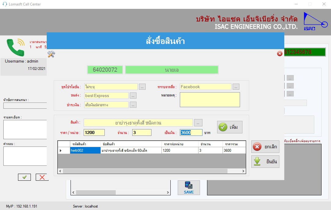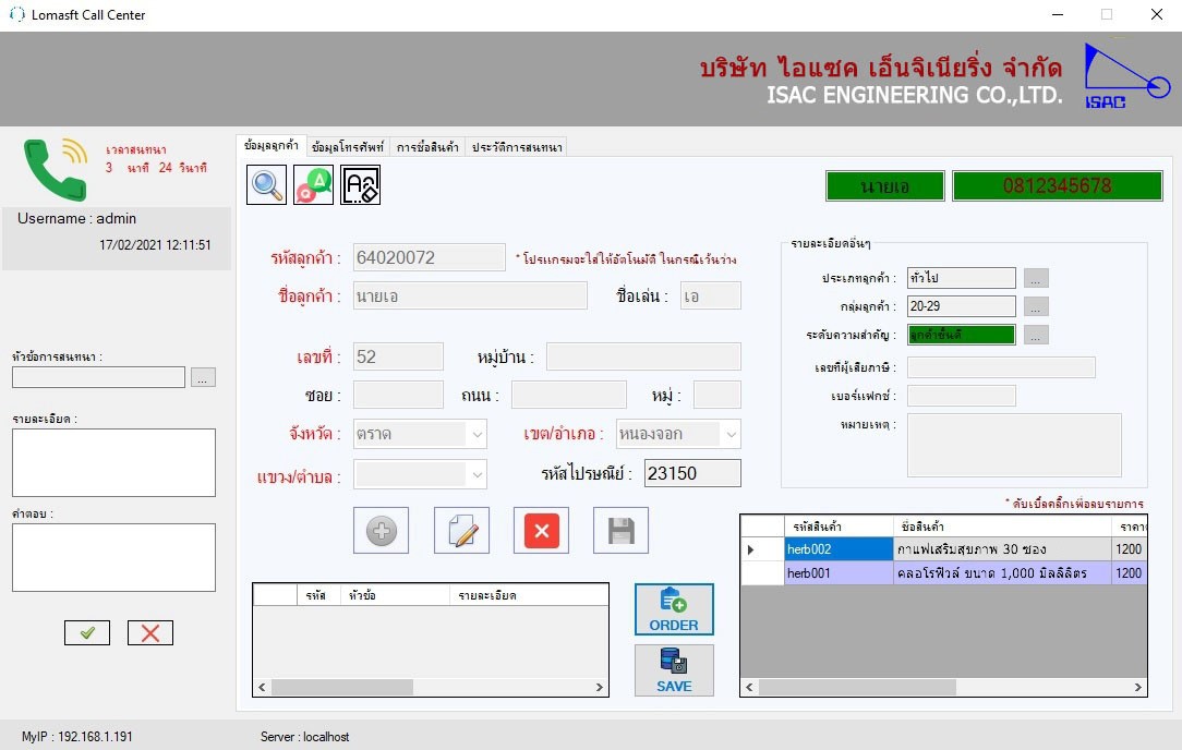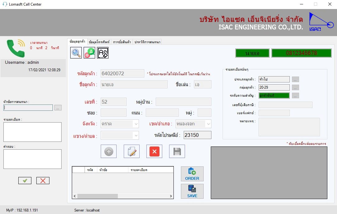 3. เมื่อมีสายเรียกเข้าระบบจะ Pop-Up หน้าจอแสดงประวัติข้อมูลของลูกค้า ที่มีอยู่ในฐานข้อมูลอัตโนมัติ