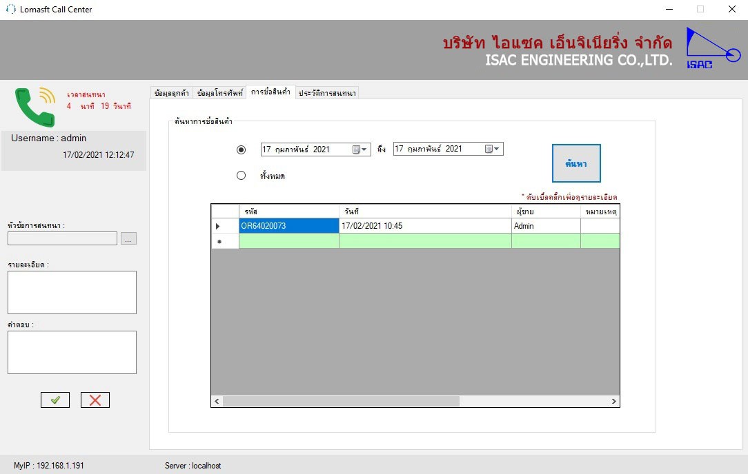 สามารถค้นหาประวัติการสั่งซื้อสินค้าได้จากเบอร์โทรศัพท์เมื่อมีสายเรียกเข้ามา ทำการเช็กข้อมูลได้จากวันที่หรือเช็กข้อมูลทั้งหมด และกดปุ่มค้นหา รายการที่ลูกค้าสั่งซื้อจะแสดงรายงานผลที่ต้องการค้นหา