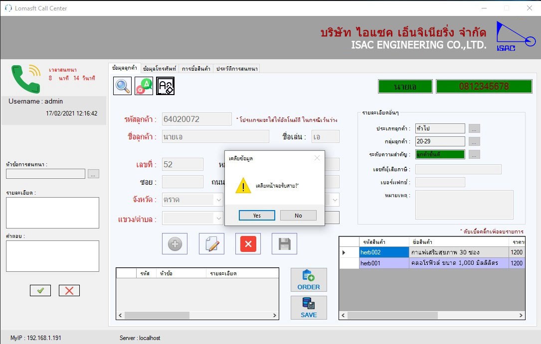 หน้าจอแสดงประวัติข้อมูลลูกค้า เมื่อมีสายเรียกเข้า