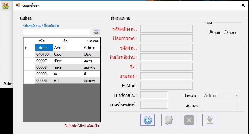 การสร้างข้อมูล Admin (ผู้ดูแล) และ User (ผู้ใช้งาน) ให้กรอกรายละเอียดข้อมูลผู้ใช้งาน เช่น รหัสพนักงาน, Username, รหัสผ่าน, ยืนยันรหัสผ่าน, ชื่อ, นามสกุล, เพศ, E-mail, เบอร์ภายใน และเบอร์โทรศัพท์ กำหนดประเภทผู้ใช้งาน เช่น Admin หรือพนักงาน กำหนดสถานะผู้ใช้งาน เช่น ปกติ,ลาออก