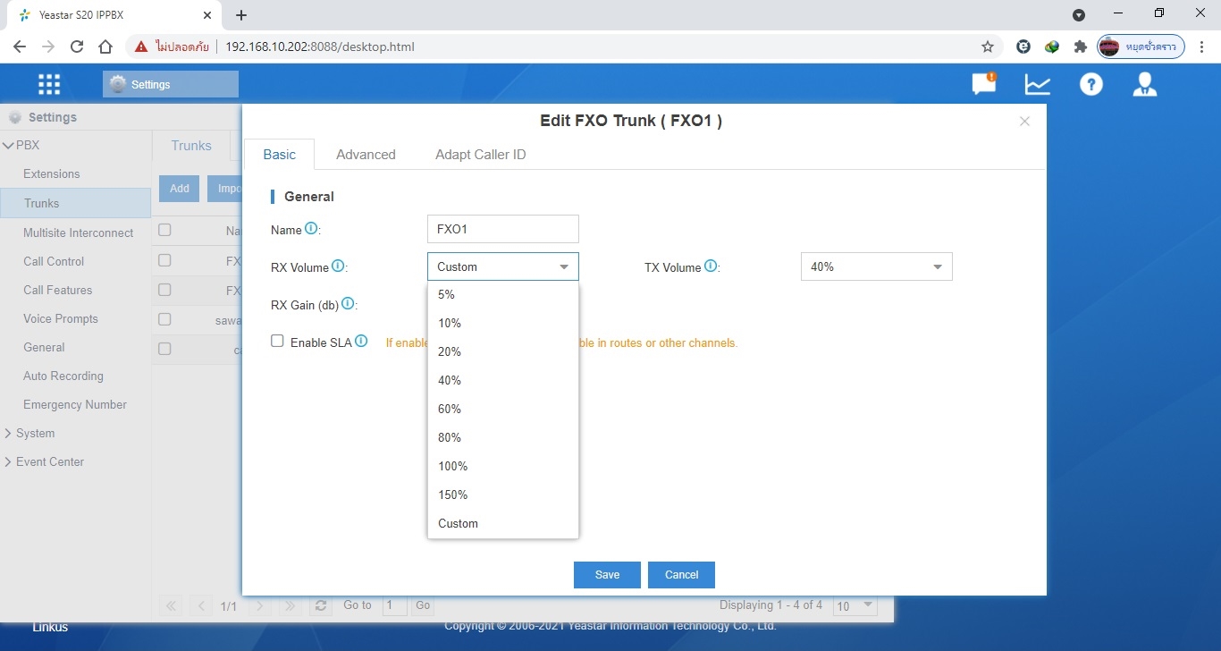 วันนี้เราจะมาแนะนำวิธีปรับความดังของเสียง FXO Trunk โดยปรับที่ Rx Volume เริ่มตั้งแต่ 5%-150% จะมีค่า Default อยู่ที่ 40%