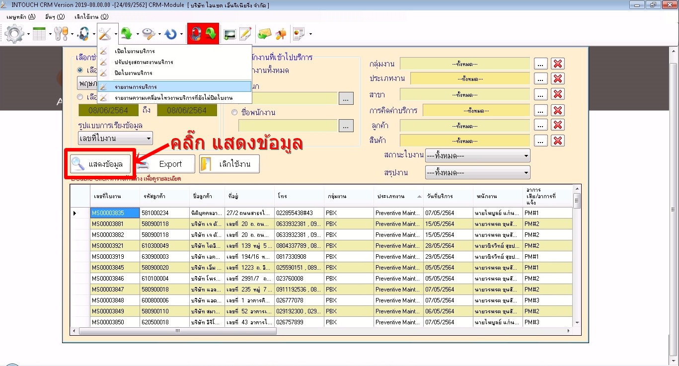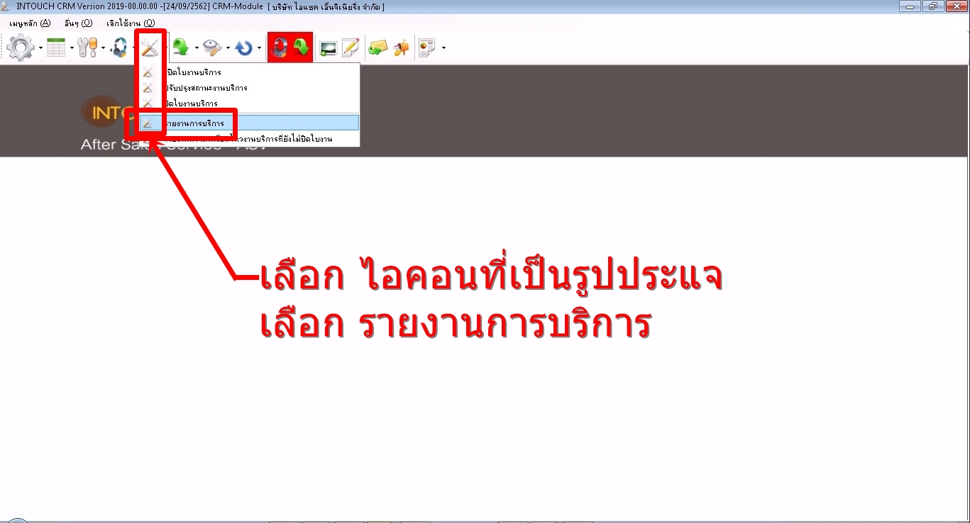 คลิ๊ก เลือกที่ไอคอนรูปประแจ เลือกรายงานการบริการ