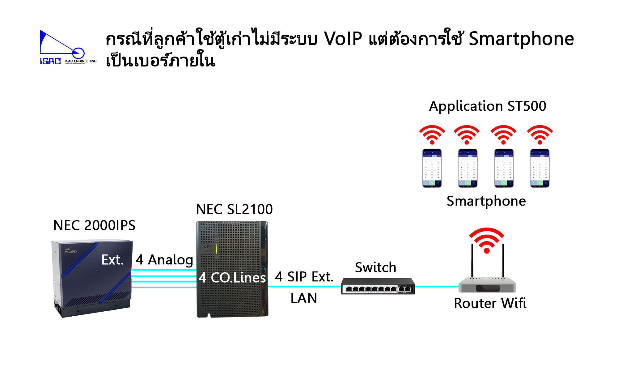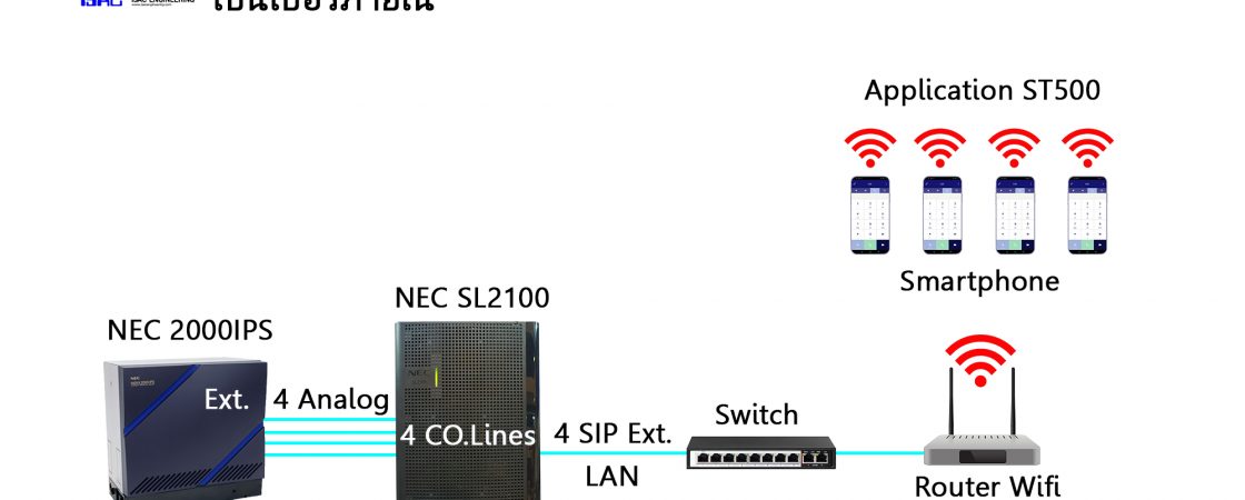 จาก Diagram การเชื่อมต่อ SL2100 เปรียบเสมือน Gateway ที่มีทั้ง FXS และ FXO เมื่อเชื่อมต่อตามรูปเรียบร้อยแล้ว สามารถใช้เบอร์ภายในที่เป็น SIP Ext. ผ่าน Application ST500 บน Smartphone ที่จับสัญญาณ WiFi วงเดียวกับตู้ NEC SL2100 ได้ทันที