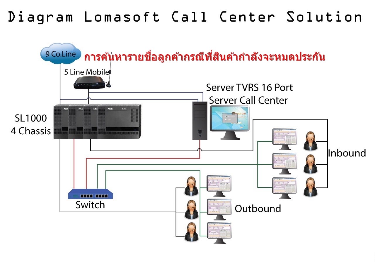 Lomasoft Call Center Solutions เป็นการผสมผสานการทำงานระหว่าง PBX และ Software Lomasoft Call Center โดยมีCTI ( Computer Telephony Integration ) เป็นตัวกลางในการส่งข้อมูลสถานะการใช้งานพร้อมCaller ID ให้ Software Lomasoft Call Center Pop-up ข้อมูลโทรศัพท์และข้อมูลลูกค้าในกรณีที่มีการบันทึกในระบบ ทั้งนี้ในกรณีที่ไม่มีข้อมูล ระบบจะทำการส่งเบอร์โทรศัพท์และขณะสนทนาสามารถบันทึกข้อมูลลูกค้าลงในระบบได้ทันที ไม่ว่าจะเป็นชื่อที่อยู่ , บันทึกการสนทนา ฯ นอกจากนี้ยังมี Options เสริมคือ TVRS ( Telephone Voice Recorder Systems ) บักทึกเสียงสนทนาทางโทรศัพท์เพื่อนำข้อมูลเสียงมาปรับปรุงการให้บริการอีกด้วย