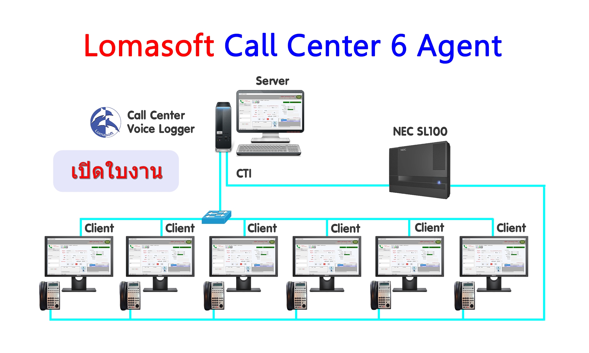 Lomasoft Call Center Solutions เป็นการผสมผสานการทำงานระหว่าง PBX และ Software Lomasoft Call Center โดยมีCTI ( Computer Telephony Integration ) เป็นตัวกลางในการส่งข้อมูลสถานะการใช้งานพร้อมCaller ID ให้ Software Lomasoft Call Center Pop-up ข้อมูลโทรศัพท์และข้อมูลลูกค้าในกรณีที่มีการบันทึกในระบบ ทั้งนี้ในกรณีที่ไม่มีข้อมูล ระบบจะทำการส่งเบอร์โทรศัพท์และขณะสนทนาสามารถบันทึกข้อมูลลูกค้าลงในระบบได้ทันที ไม่ว่าจะเป็นชื่อที่อยู่ , บันทึกการสนทนา ฯ นอกจากนี้ยังมี Options เสริมคือ TVRS ( Telephone Voice Recorder Systems ) บักทึกเสียงสนทนาทางโทรศัพท์เพื่อนำข้อมูลเสียงมาปรับปรุงการให้บริการอีกด้วย