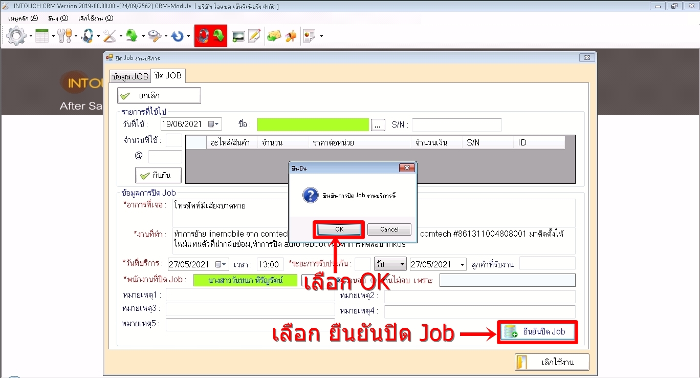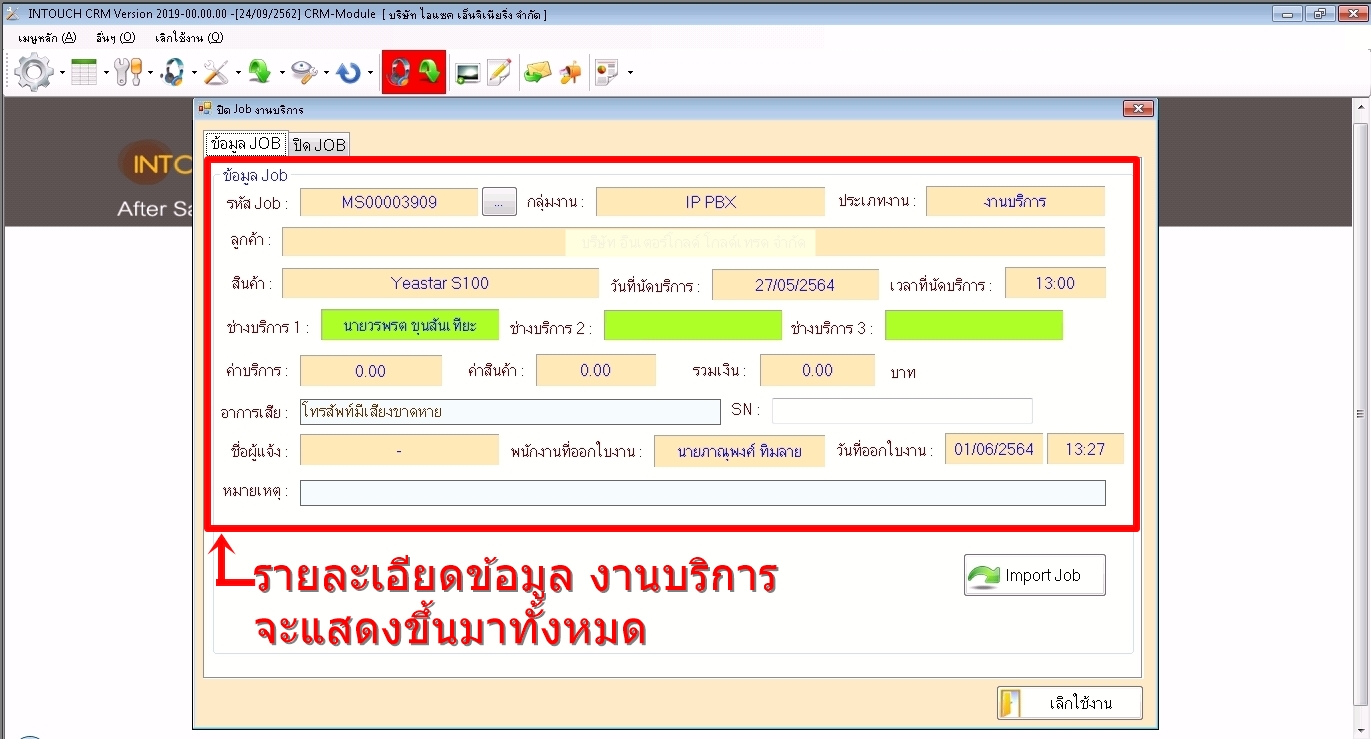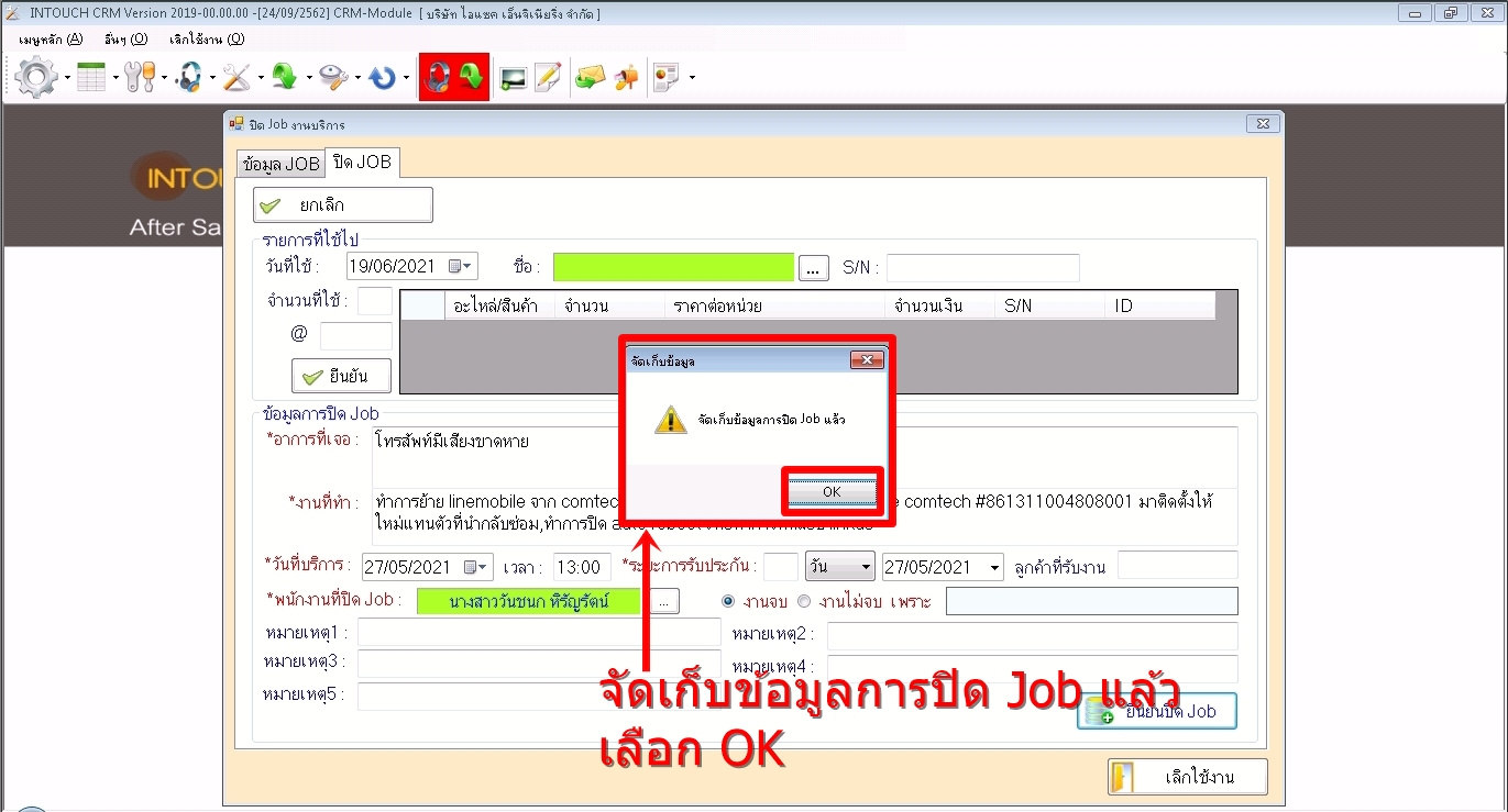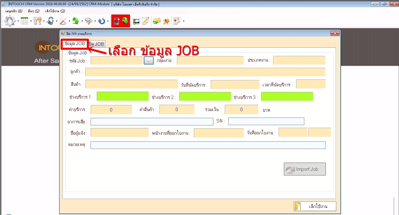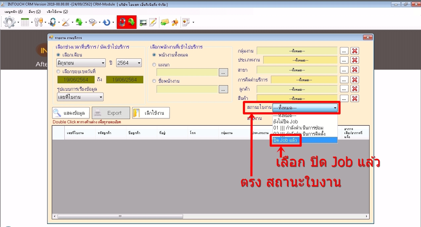 เลือก สถานะใบงาน เลือกปิด Job แล้ว