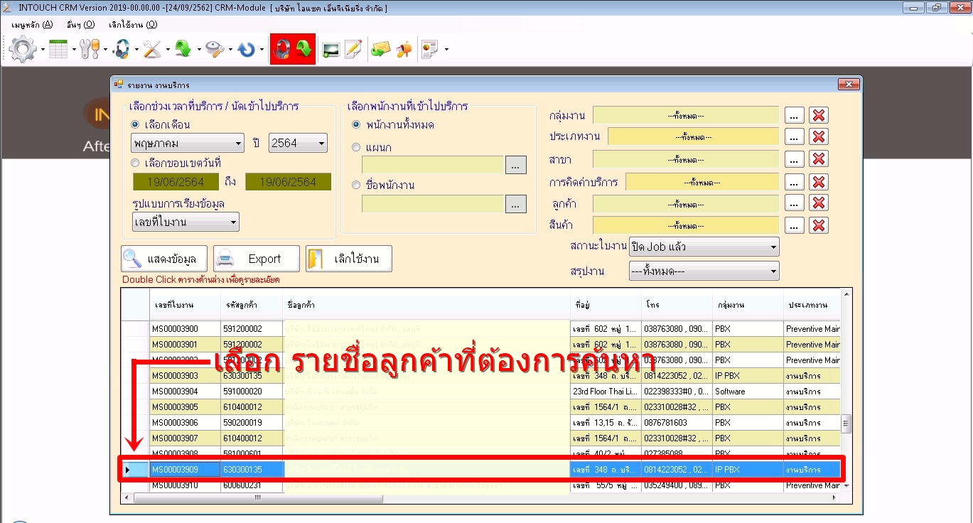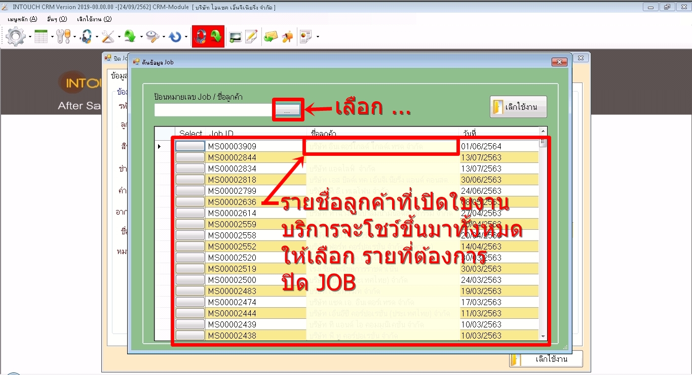 เลือกที่ปุ่มจุดสามจุด รายชื่อลูกค้าที่เปิดใบงานบริการจะโชว์ขึ้นมาทั้งหมด