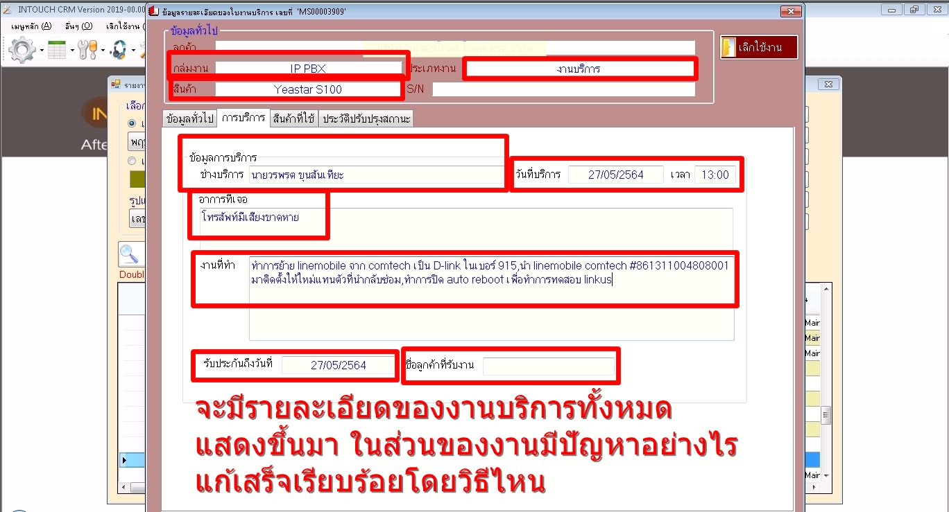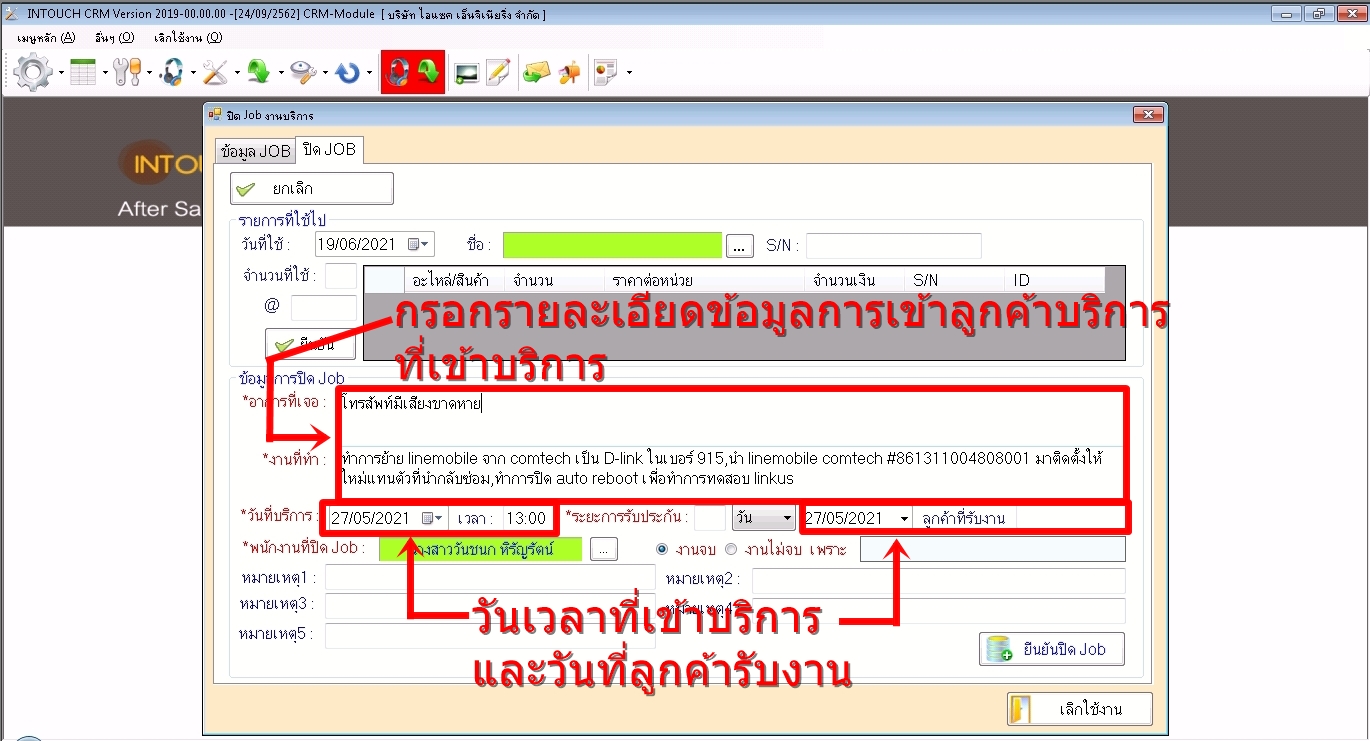 กรอกรายละเอียดข้อมูลการเข้าบริการลูกค้า อาการที่เจอ งานที่ทำ วันที่เข้าบริการ วันที่ลูกค้ารับงาน