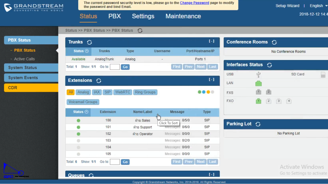 1.เข้า IP ที่ตู้สาขา UCM6204 โดยเราจะต่อสายนอกที่เป็น Analog เข้าที่ Port 1 เเละเบอร์ภายในที่ตั้งไว้จะมีเบอร์100 ฝ่าย Sales เบอร์101 ฝ่าย Support เบอร์102 ฝ่าย Operator