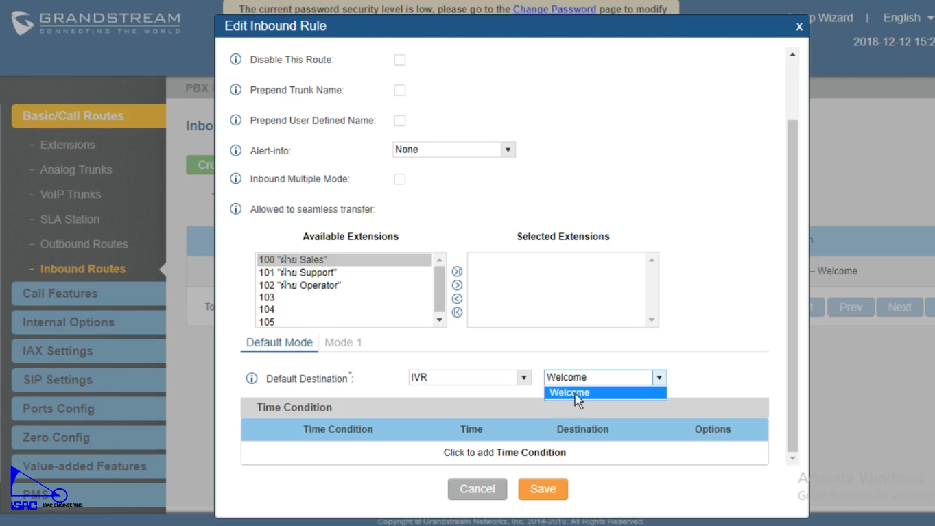 9.จากนั้นต้องไปปรับเมื่อมีสายนอกโทรเข้ามาที่ PBX > Basic/Call Routes > Inbound Routes เมื่อเลือกรูปแบบที่ต้องการแล้วให้มาที่ Default Destination ถ้าค่าปกติ มีสายนอกโทรเข้ามาจะติดเป็นเบอร์ภายใน ต้องปรับเป็น IVR เเล้วเลือกรูปแบบที่เราสร้างไว้ข้างต้น