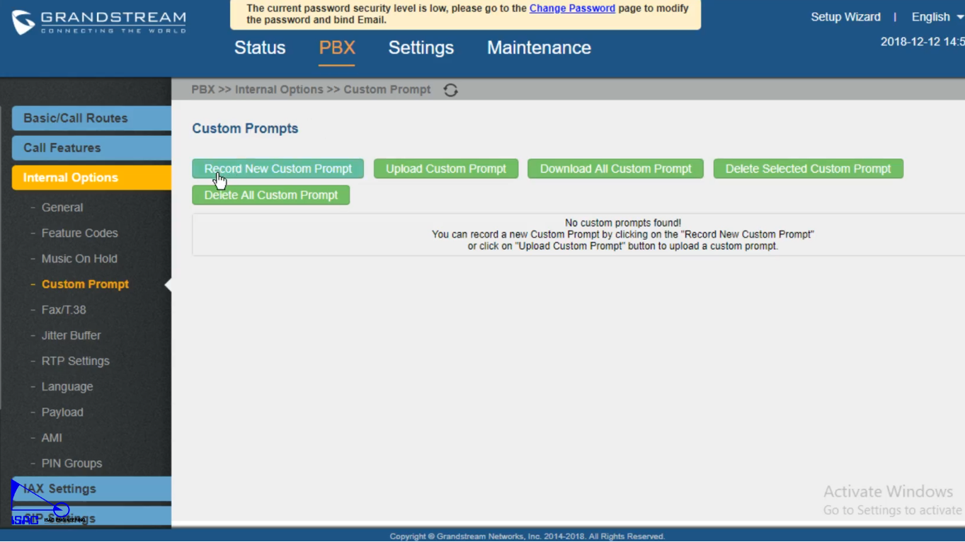 3.เมื่อกดเข้ามาเเล้วจะมีให้เลือกว่าต้องการอัดเสียงใหม่หรือจะอัพโหลดจากข้างนอกเครื่องเข้ามาก็ได้ แต่ทั้งนี้ทั้งนั้นเราจะให้อัดใหม่ให้ดูกันเลยโดยกด Record New Custom Prompt
