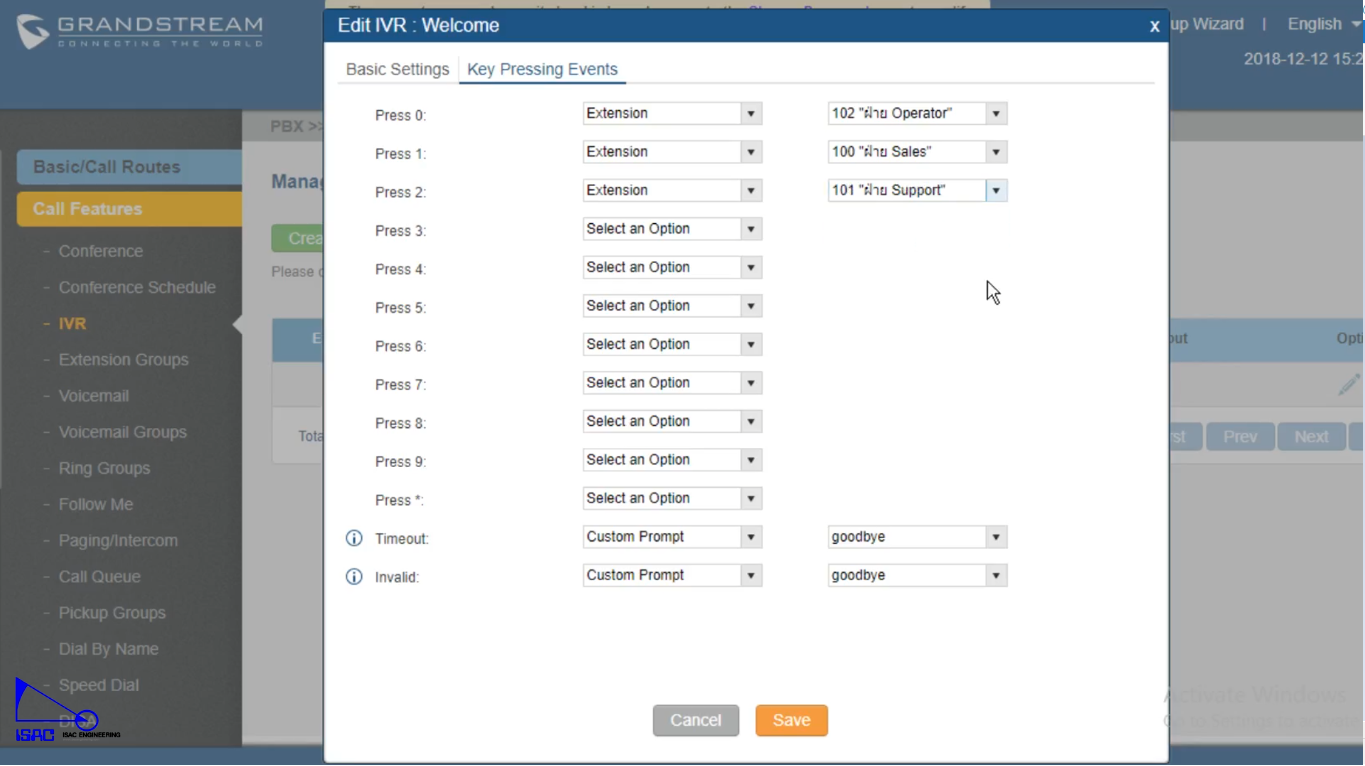 8.จากนั้นต้องมากำหนด Key ภายในให้มาที่ Key Pressing Events โดยในส่วนนี้สามารถกำหนดรูปแบบที่จะใช้ได้เลย ทางเราจะทำให้ง่ายต่อการเข้าใจหลังจากหมดเสียงตอบรับอัตโนมัติให้กด เบอร์ 0 = 102 ฝ่าย Operator เบอร์ 1 = 100 ฝ่าย Sales เบอร์ 2 = 101 ฝ่าย Support ปรับเรียบร้อยแล้วอย่าลืมกด Save